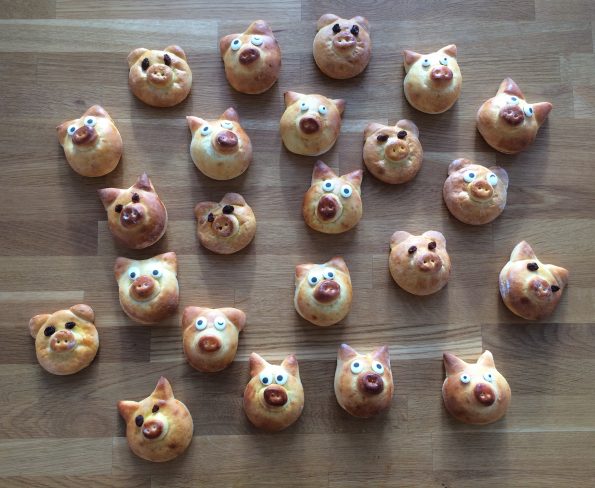 Den Teig ca. 0,5 cm dick ausrollen und mit rundem Ausstecher / Glas Kreis ausstechen für die Köpfe. Auf das Backblech mit Backpapier legen und mit Eigelb und Milch bestreichen. Mit kleinerem Aussstecher / Deckel einer Wasserflassche die Nasen ausstechen und auf die Köpfe setzen. Mit einem Schaschlick-Stäbchen die Nasenlöser modellieren. Mit einem Messer kleine Dreiecke abschneiden und als Ohren an die Köpfe ‚kleben‘. Noch einmal mit Ei-Milch-Gemisch bestreichen.